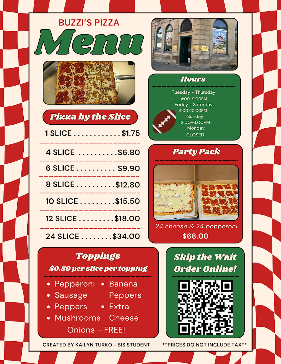 Whether you’re stopping by for a quick slice or grabbing a full meal with drinks and sides, Buzzi’s Pizza delivers great flavors and plenty of choices to satisfy every craving.